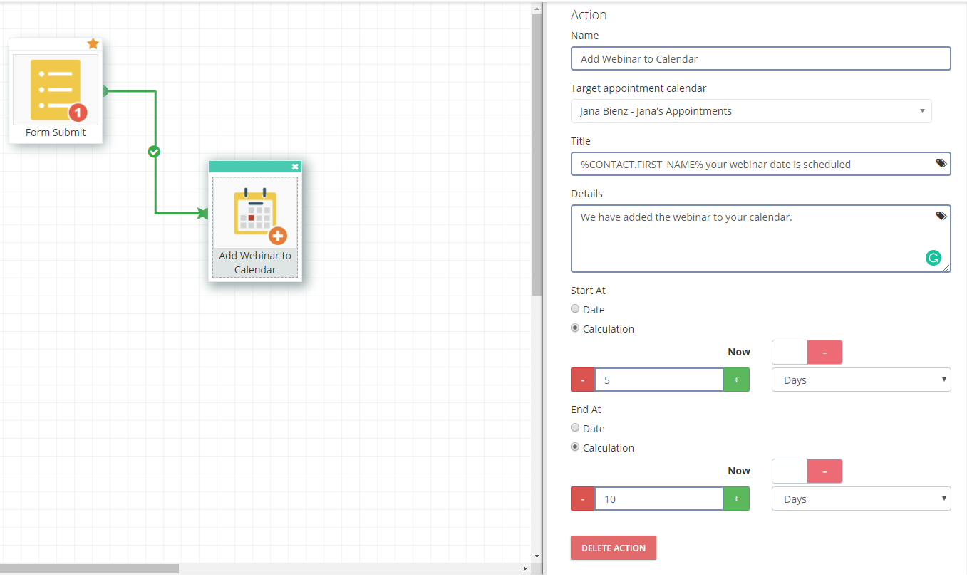 The new calendar item is available in the workflow builder for campaigns. Because these campaign workflows are run on a per-contact basis, you can also add in info about the contact that’s going through the campaign like name, email, phone number, company name, etc. We think that customers are going to find them really handy when building campaign sequences that blend automated and manual processes together.